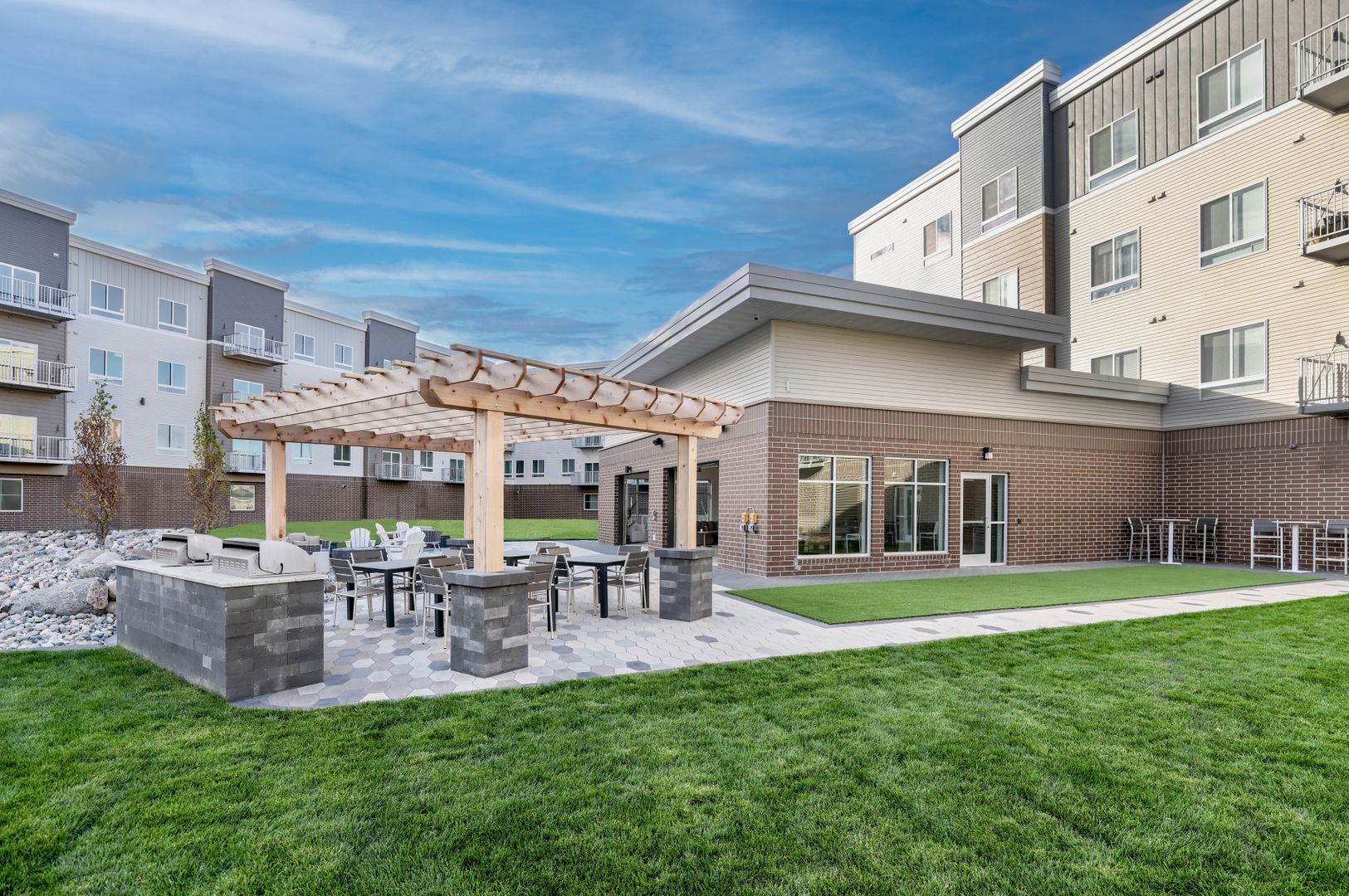 The Retreat features a centrally located clubhouse with conveniences including a fitness studio, full kitchen, entertainment center, and sports simulator. The garage-door style openings in the clubroom bring the outdoors in and open to a patio with grilling stations, a fire pit and ample green space for yard games.