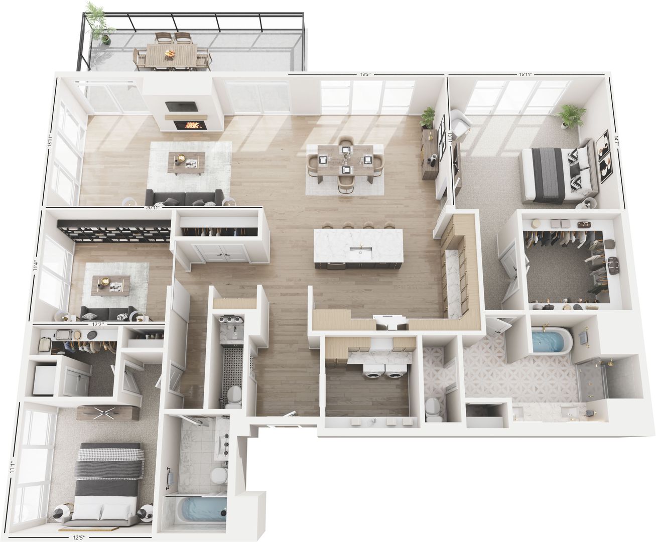 Penthouse Unit Features: Whirlpool front-load washer and dryer, stainless steel Kitchenaid appliances with counter-depth French door refrigerator, quartz backsplash, wine bar with under-counter wine cellar, 36" exhaust hood, double oven, Wolf 6-burner gas range, Napoleon fireplace, and an outdoor grill.