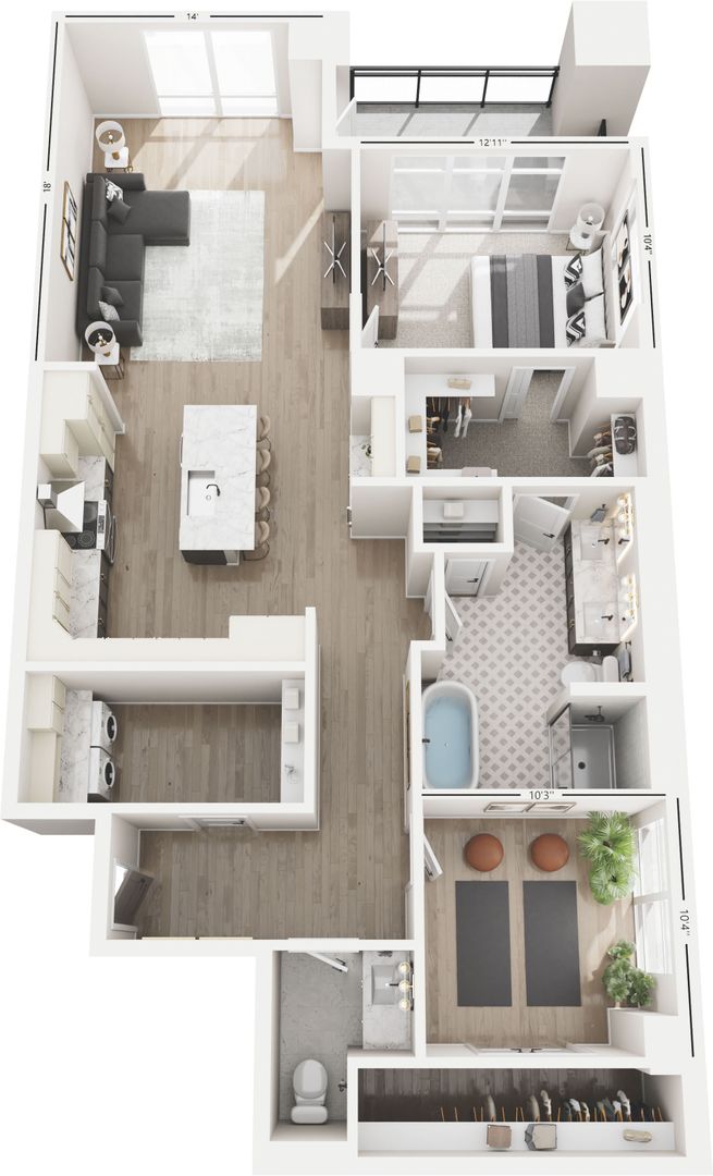 Community Amenities: Fitness room & yoga studio with backlit mirrors; sauna with changing suite; lobby with complimentary coffee bar, flex work/lounge space, double-sided gas fireplace, and pool table; mail room and secure package room with full-size commercial beverage center; lounge with kitchenette; fenced dog run and pet spa; resident storage; fifth-floor sky lounge with outdoor patio, fire pit with lounge area, grill and prep station, and terrace.