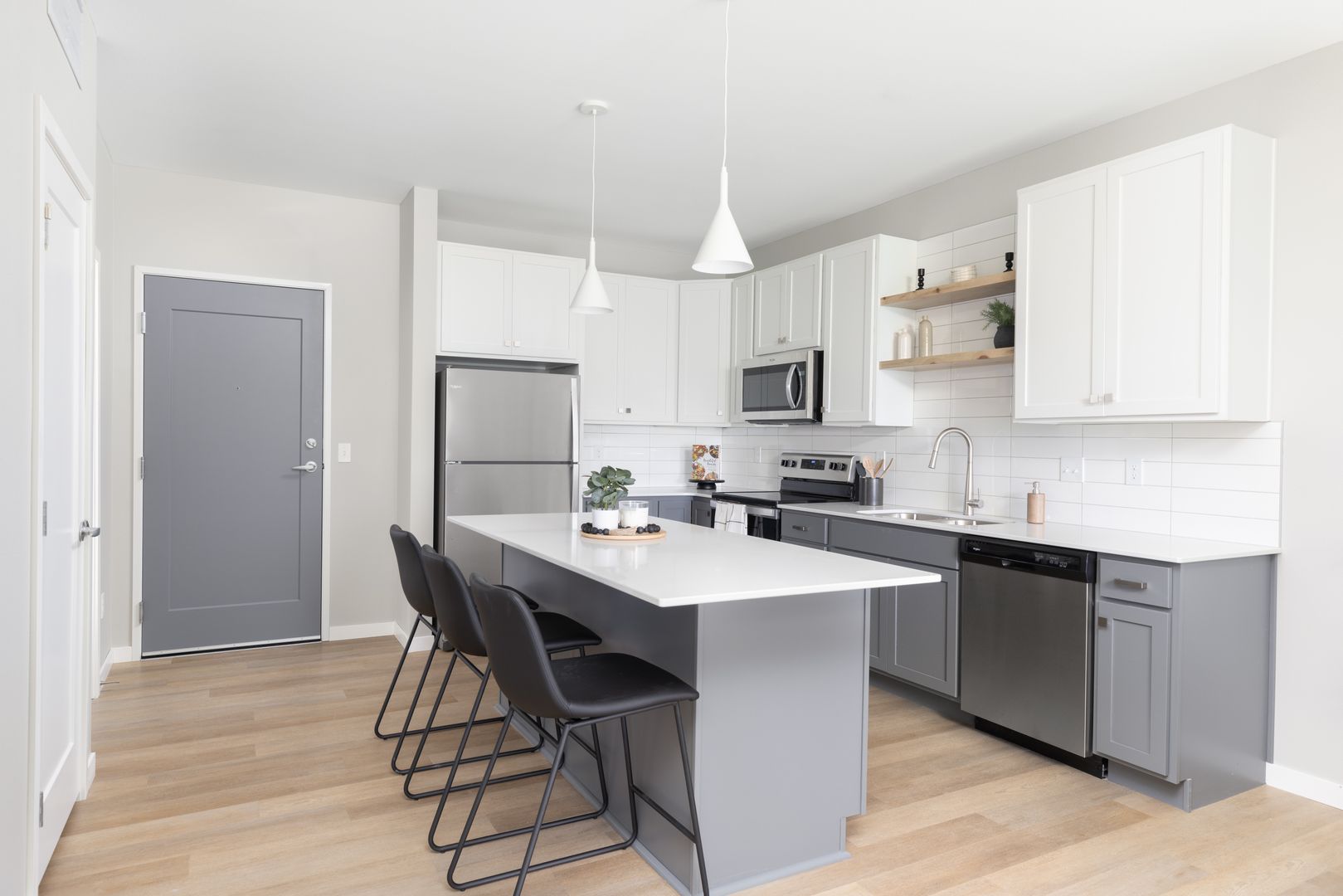 Wild Oak's studio, 1, 2, and 3-bedroom floor plans were expertly designed to maximize space. Each apartment home is filled with natural light, open-concept kitchens and in-home washer and dryer. Upgraded hand-picked finishes include-wood inspired flooring, tile backsplash, and quartz counters that create an upgraded living experience.