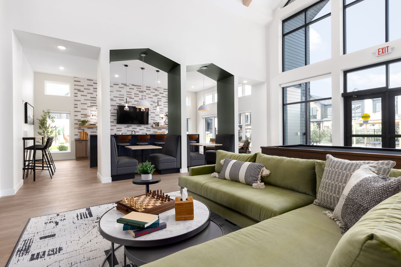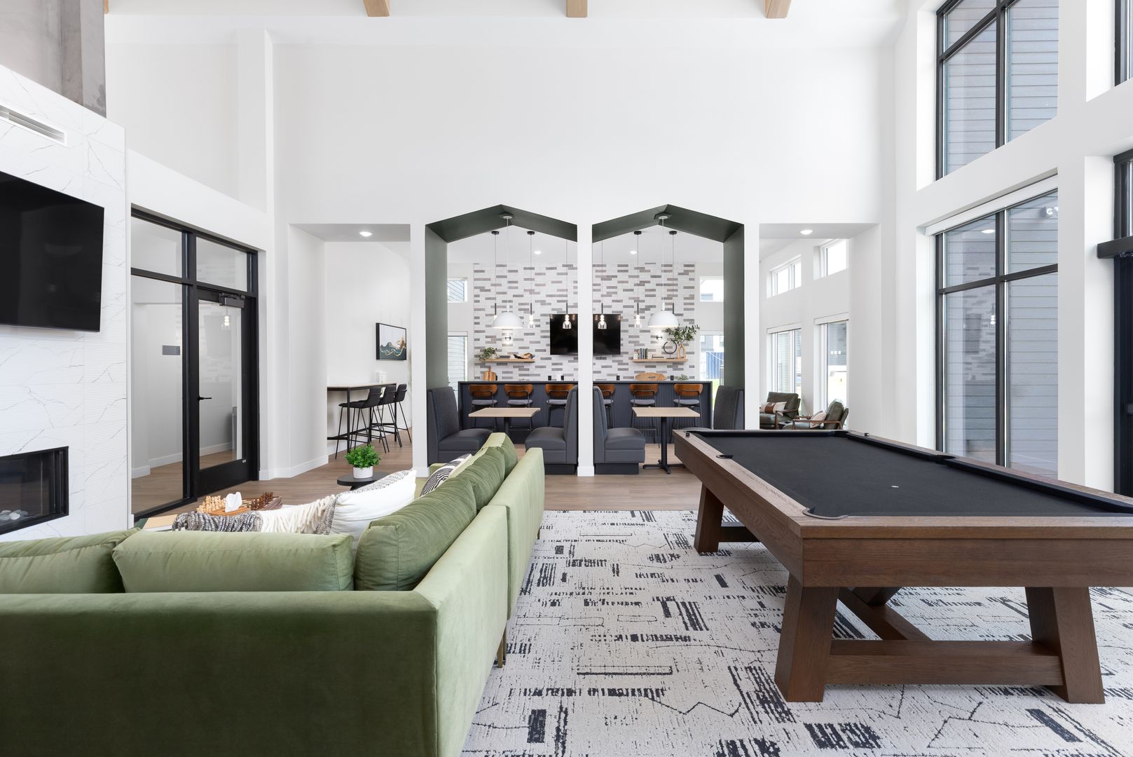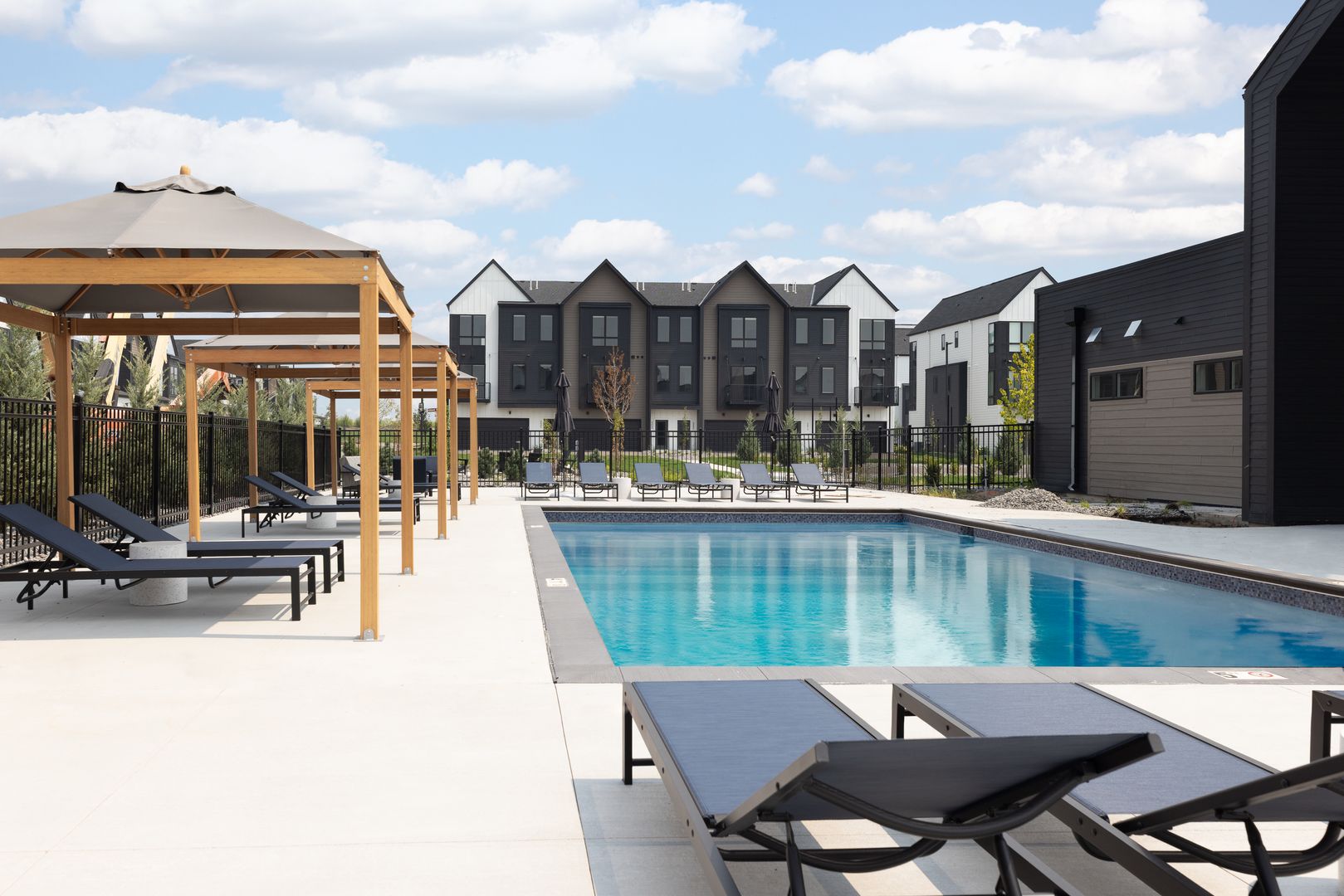 Community amenities: snow removal and lawn maintenance, pickleball court, resort-style outdoor pool with sun loungers, fitness and yoga studio, clubroom with sports simulator, and dog park.