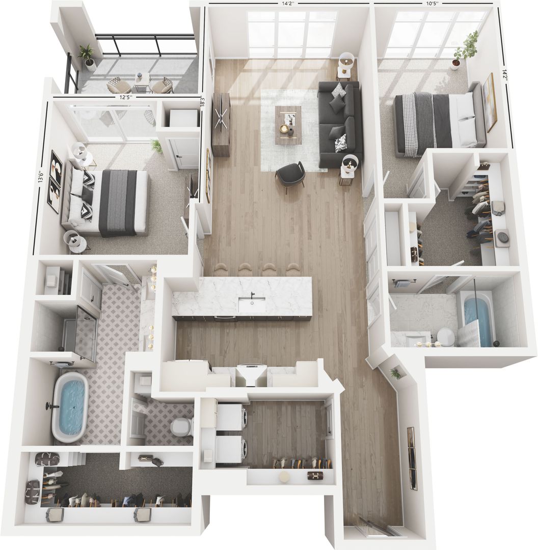 Penthouse Unit Features: Whirlpool front-load washer and dryer, stainless steel Kitchenaid appliances with counter-depth French door refrigerator, quartz backsplash, wine bar with under-counter wine cellar, 36" exhaust hood, double oven, Wolf 6-burner gas range, Napoleon fireplace, and an outdoor grill.