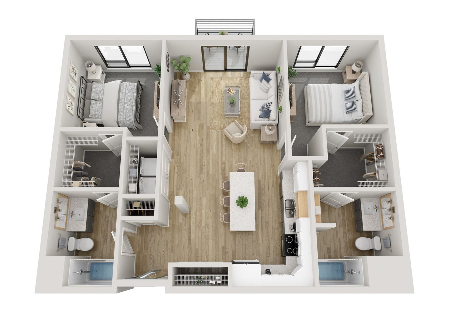 Wild Oak's studio, 1, 2, and 3-bedroom floor plans were expertly designed to maximize space. Each apartment home is filled with natural light, open-concept kitchens and in-home washer and dryer. Upgraded hand-picked finishes include-wood inspired flooring, tile backsplash, and quartz counters that create an upgraded living experience.