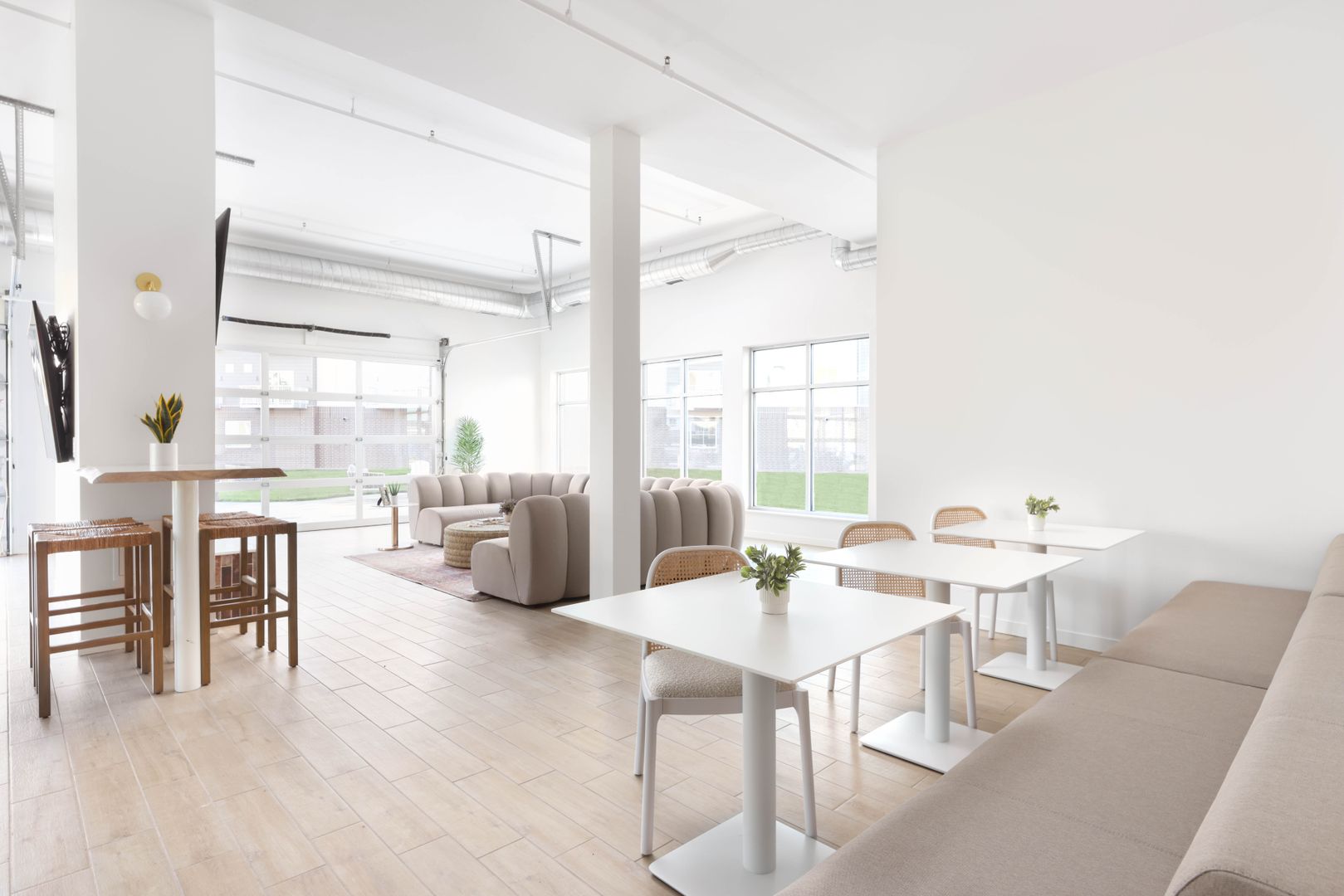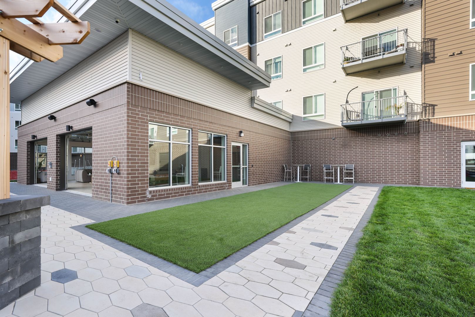 The Retreat features a centrally located clubhouse with conveniences including a fitness studio, full kitchen, entertainment center, and sports simulator. The garage-door style openings in the clubroom bring the outdoors in and open to a patio with grilling stations, a fire pit and ample green space for yard games.