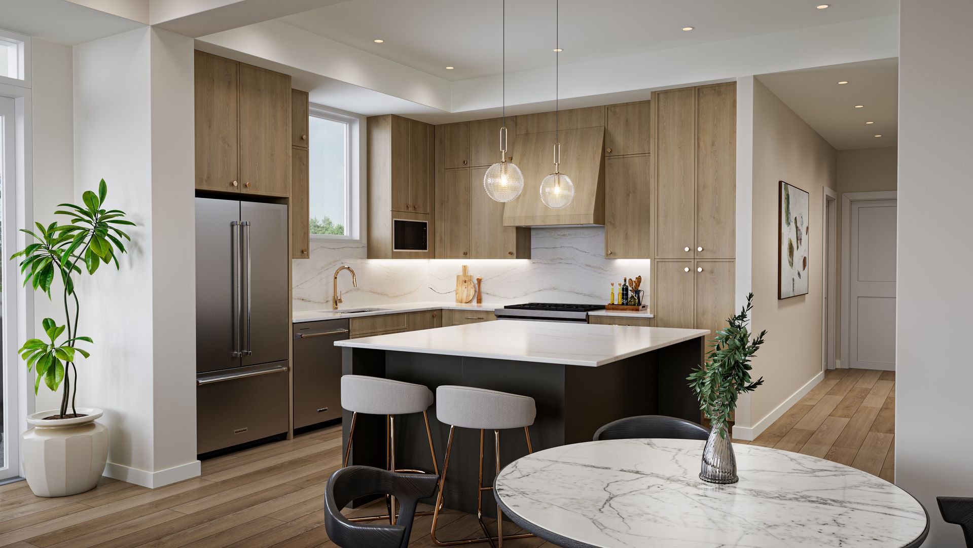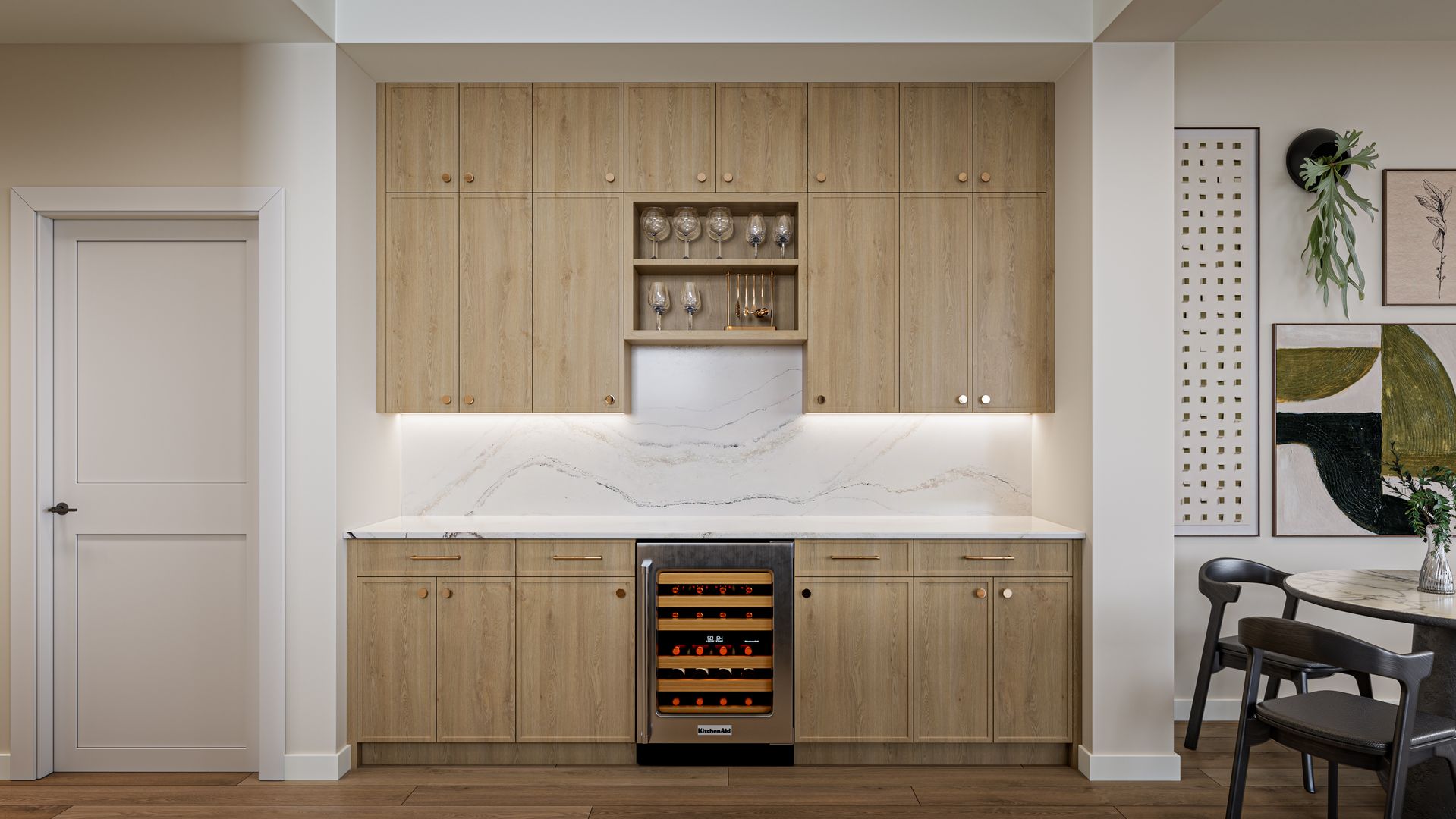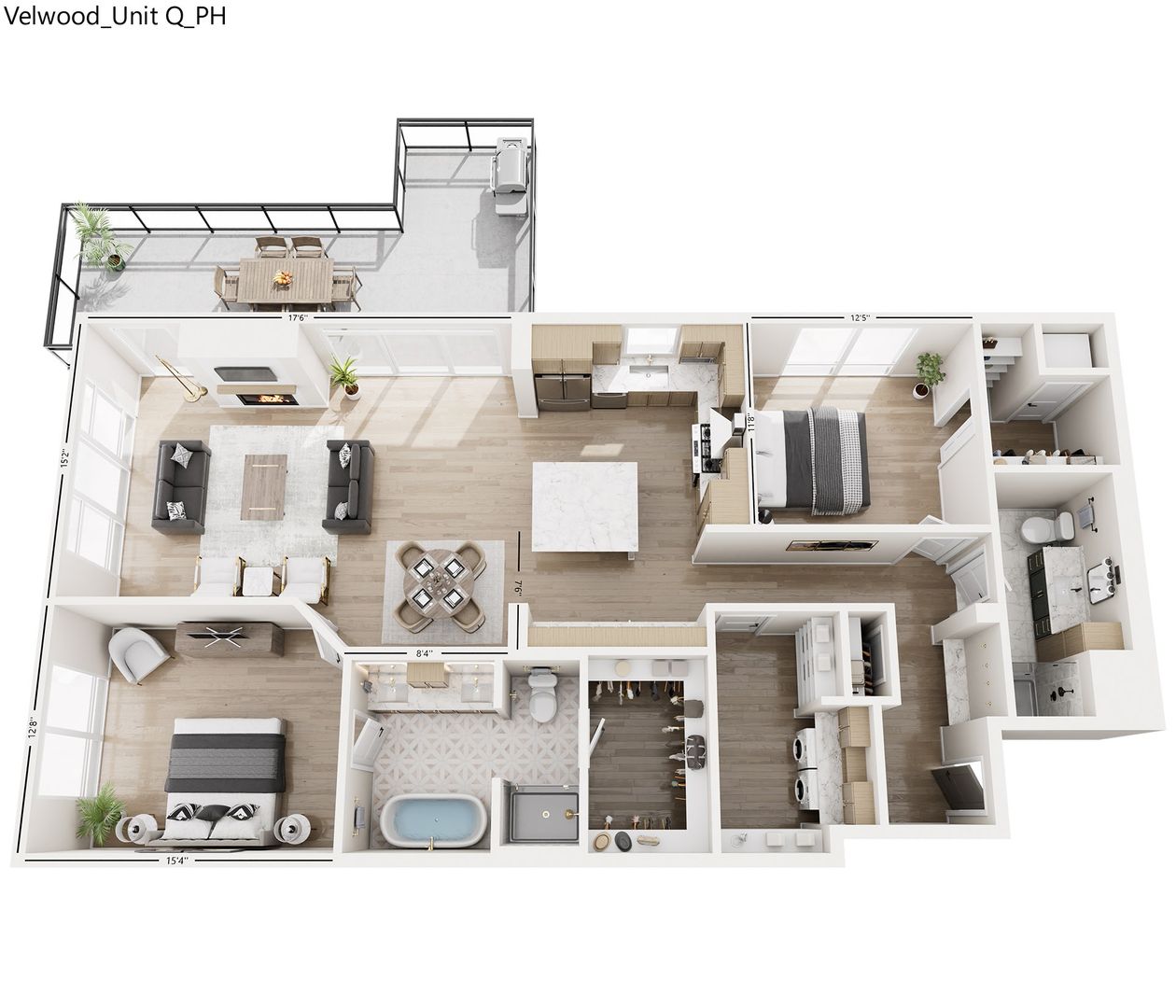 Penthouse Unit Features: Whirlpool front-load washer and dryer, stainless steel Kitchenaid appliances with counter-depth French door refrigerator, quartz backsplash, wine bar with under-counter wine cellar, 36" exhaust hood, double oven, Wolf 6-burner gas range, Napoleon fireplace, and an outdoor grill.