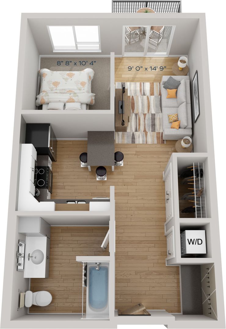 The bright, open-concept floor plans are fit with nine-foot ceilings, quartz countertops, subway tile backsplash, stainless steel appliances and and an island with pendant lighting. The large windows placed throughout each unit provide an abundance of natural light, bringing the outdoors in. You will especially love the in-home washer and dryer, private balcony and ample linen and closet storage.