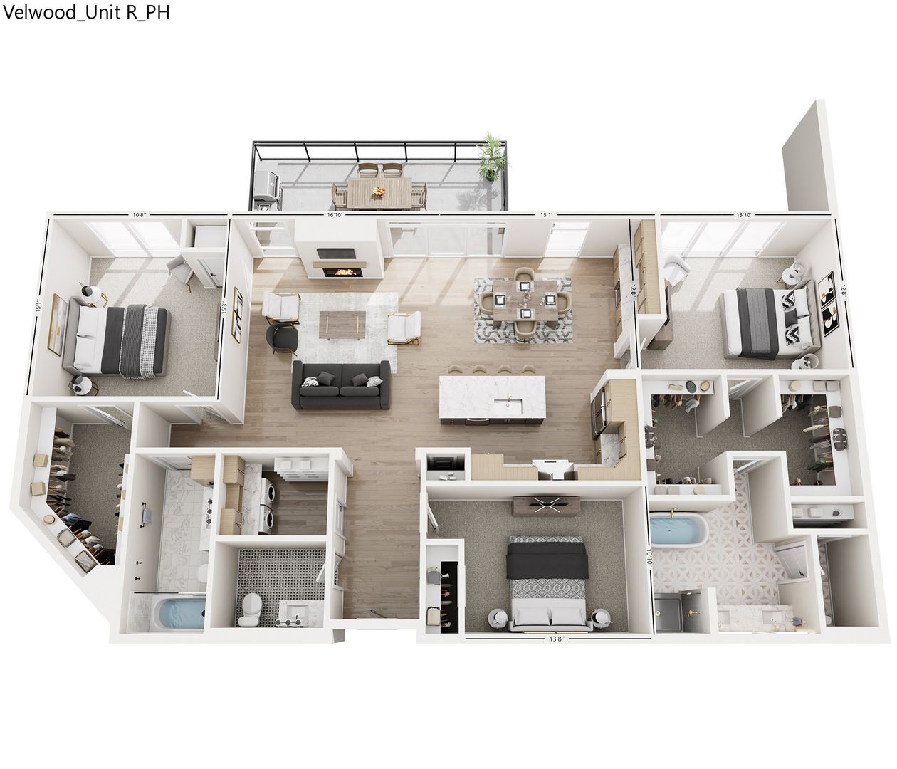 Penthouse Unit Features: Whirlpool front-load washer and dryer, stainless steel Kitchenaid appliances with counter-depth French door refrigerator, quartz backsplash, wine bar with under-counter wine cellar, 36" exhaust hood, double oven, Wolf 6-burner gas range, Napoleon fireplace, and an outdoor grill.