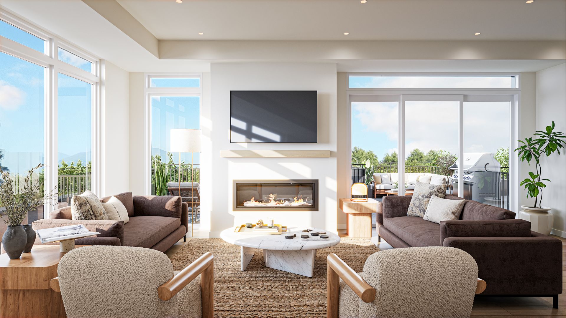 Community Amenities: Fitness room & yoga studio with backlit mirrors; sauna with changing suite; lobby with complimentary coffee bar, flex work/lounge space, double-sided gas fireplace, and pool table; mail room and secure package room with full-size commercial beverage center; lounge with kitchenette; fenced dog run and pet spa; resident storage; fifth-floor sky lounge with outdoor patio, fire pit with lounge area, grill and prep station, and terrace.