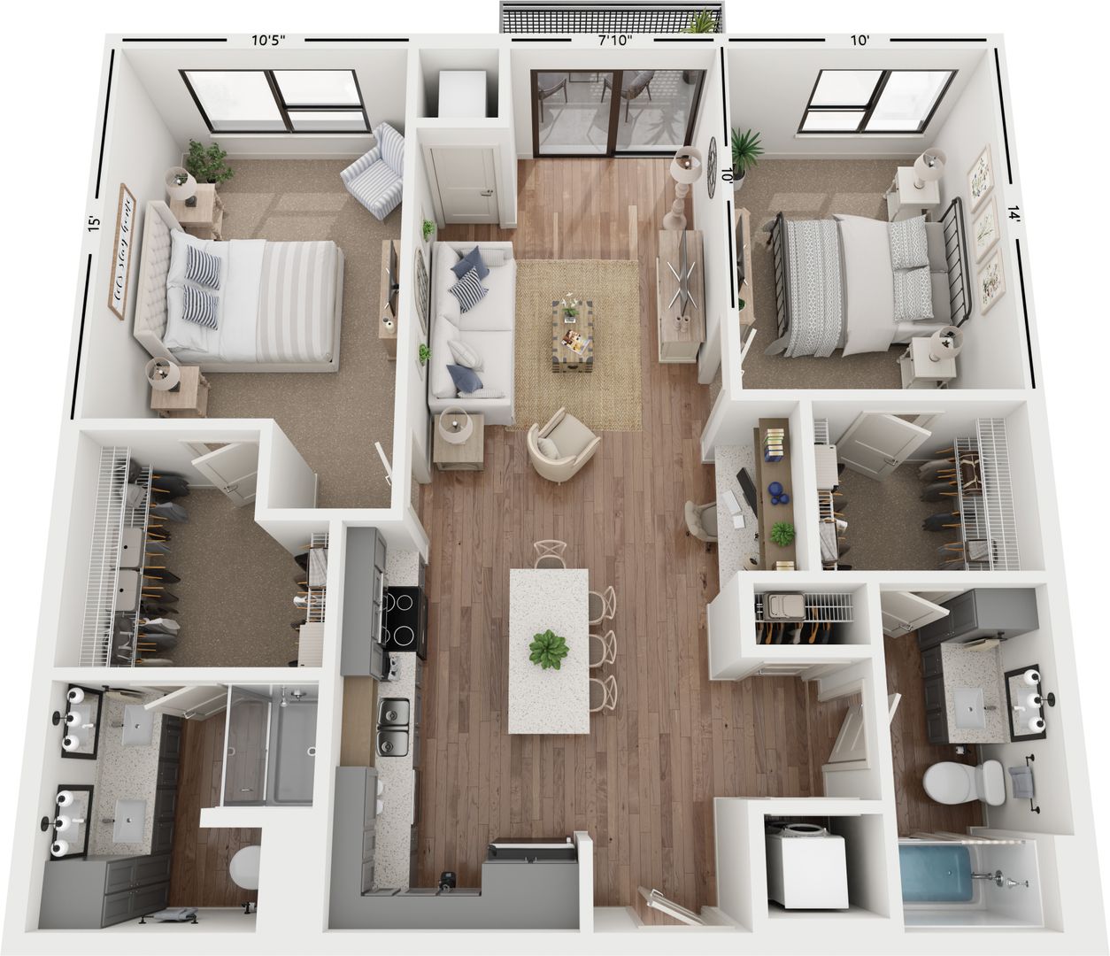Lynvue's alcove, studio, 1, 2, and 3-bedroom floor plans were expertly designed to maximize space. Each apartment home is filled with natural light, open-concept contemporary kitchens and in-home washer and dryer. Upgraded hand-picked finishes include-wood inspired flooring, tile backsplash, and quartz countertops that create an upgraded living experience.