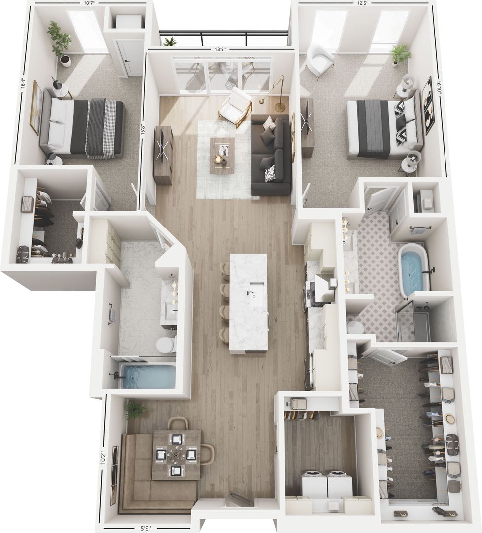 Penthouse Unit Features: Whirlpool front-load washer and dryer, stainless steel Kitchenaid appliances with counter-depth French door refrigerator, quartz backsplash, wine bar with under-counter wine cellar, 36" exhaust hood, double oven, Wolf 6-burner gas range, Napoleon fireplace, and an outdoor grill.